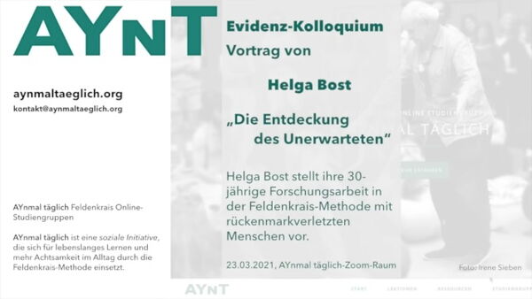 Die Unterstützung durch den Förderverein für Feldenkrais und somatisches Lernen e.V. und das persönliche Engagement seiner Vorsitzenden Herbert Hollesch und Claus-Jürgen Kocka ermöglichte dem AYnmal täglich-Studienprojekt fast zwei Jahre lang sicher zu wachsen und sich zu entwickeln.