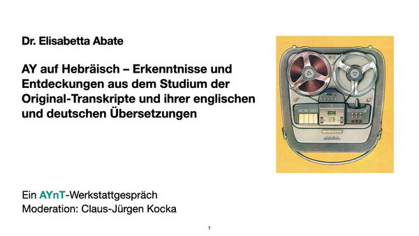 Elisabeta Abate stellt im Werkstattgespräch „AY auf Hebräisch – Erste Erkenntnisse aus Original und Übersetzungen“ anhand ausgewählter Textstellen vor, wie bereits kleine Unterschiede zwischen hebräischem Original, englischer Übersetzung und der daraus erstellten deutschen Übersetzung die Rezeption einer Lektion verändern können.