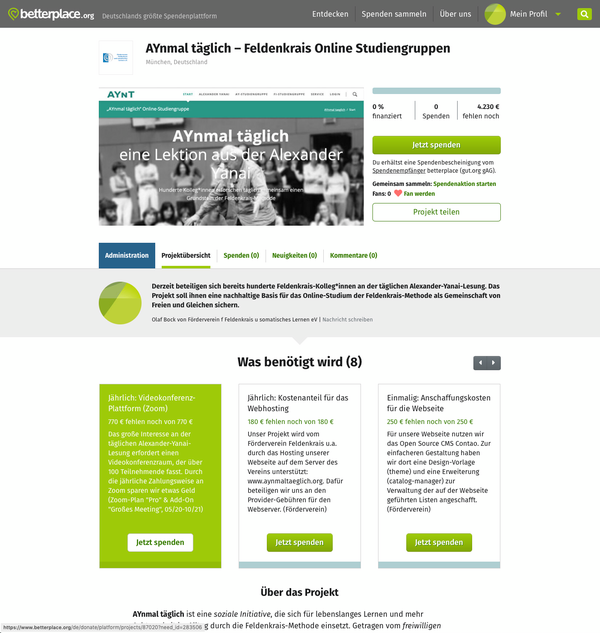 Die Unterstützung durch den Förderverein für Feldenkrais und somatisches Lernen e.V. und das persönliche Engagement seiner Vorsitzenden Herbert Hollesch und Claus-Jürgen Kocka ermöglichte dem AYnmal täglich-Studienprojekt fast zwei Jahre lang sicher zu wachsen und sich zu entwickeln.